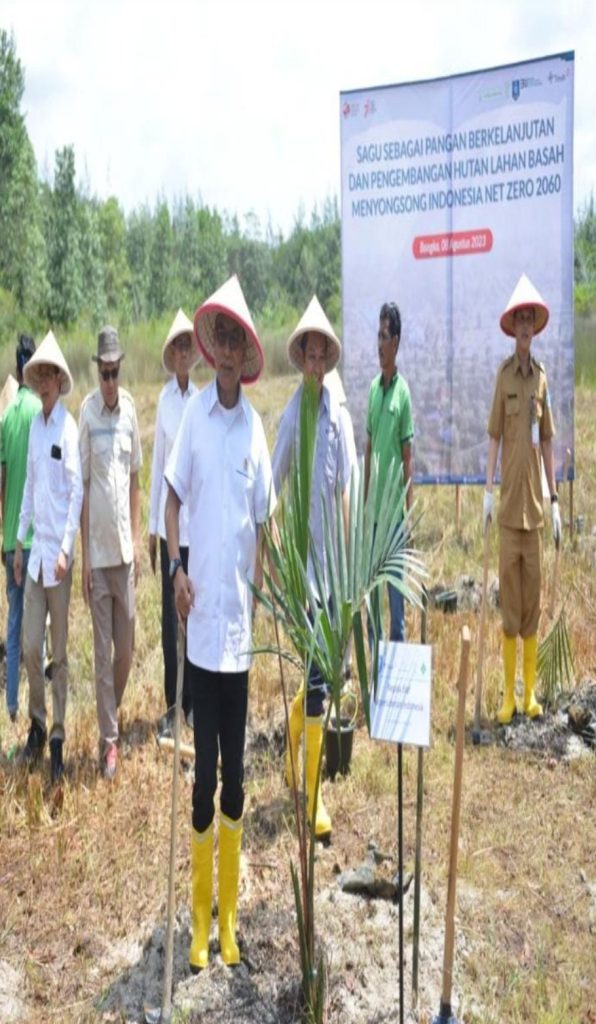 Kedatangan Moeldoko ke lahan bekas tambang PT Timah Tbk untuk melakukan penanaman, penandatangan dan deklarasi sagu sebagai pangan berkelanjutan dan pengembangan hutan lahan basah menyongsong Indonesia Net Zero 2060.