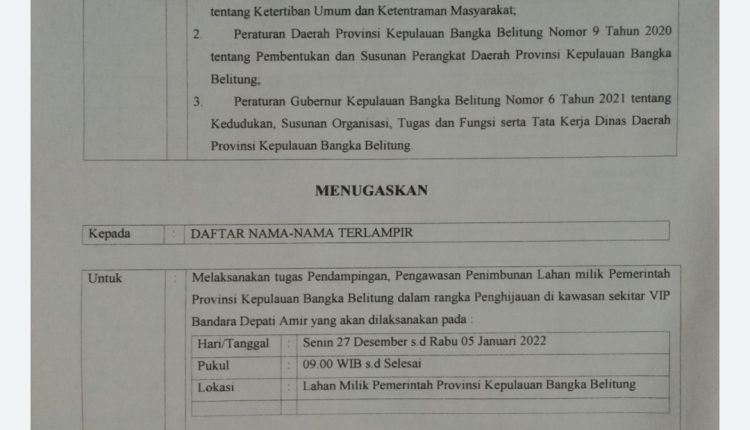 Menurut Yamoa, sesuai surat tugas Nomor : 800/2054/SATPOL PP/PTI/XII/2021, pendampingan, pengawasan penimbunan lahan atau penghijauan itu terhitung tanggal 27 Desember 2021 hingga 05 Januari 2022. Hal demikian dilakukan dengan dasar Peraturan Daerah Provinsi Kepulauan Babel nomor 17 tahun 2016 tentang ketertiban umum dan ketentraman masyarakat, Peraturan Daerah Provinsi Kepulauan Babel nomor 9 tahun 2020 tentang pembentukan dan susunan perangkat daerah Provinsi Kepulauan Babel, Peraturan Gubernur Kepulauan Babel nomor 6 tahun 2021 tentang kedudukan, susunan organisasi, tugas dan fungsi serta tata kerja dinas Daerah Provinsi Kepulauan Babel.