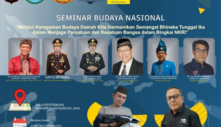 Rencana seminar ini diagendakan pada Jumat (16/13/2022) siang dimulai pukul 13.30 WIB bertempat di Makorem 045/Garuda Jaya (Gaya). Dalam kegiatan seminar terbuka ini pihaknya mengundang sejumlah narasumber atau pemateri antara lain Kapolda Bangka Belitung (Irjen Pol Yan Sultra), Komandan Korem 045/Garuda Jaya (Brigjen TNI Ujang Darwis MDA), Tokoh Lembaga Adat Melayu Bangka Belitung (Prof Dr Bustami Rahman MSc) dan seorang Budayawan/Pemerhati Sosial, Ahmadi Sopian dan Husein Soengki (wartawan Senior TVRI) yang akan memandu acara seminar tersebut