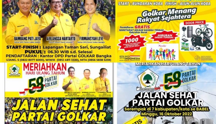 PANGKALPINANGPOST.COM (Pangkalpinang) – || Dalam rangka memperingati Hari Ulang Tahun (HUT) Partai Golkar yang ke-58, Dewan Pimpinan Daerah (DPD) tingkat II Kabupaten Bangka, Kabupaten Bangka Tengah dan Kabupaten Bangka Selatan gelar Jalan Sehat dengan berbagai rangkaian acara pada 16 Oktober 2022 nanti.