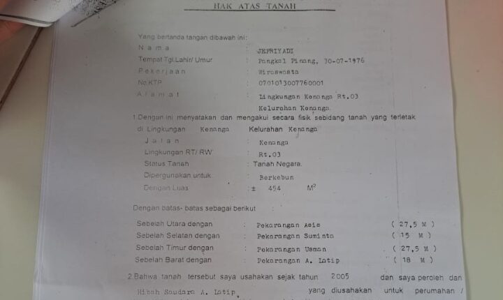 BANGKA,PPinangpost.com – Telah hilang surat pengakuan hak atas tanah, atas nama Jefriyadi yang terletak di Jalan Kenanga, RT 03, Kecamatan Sungailiat, Kabupaten Bangka.