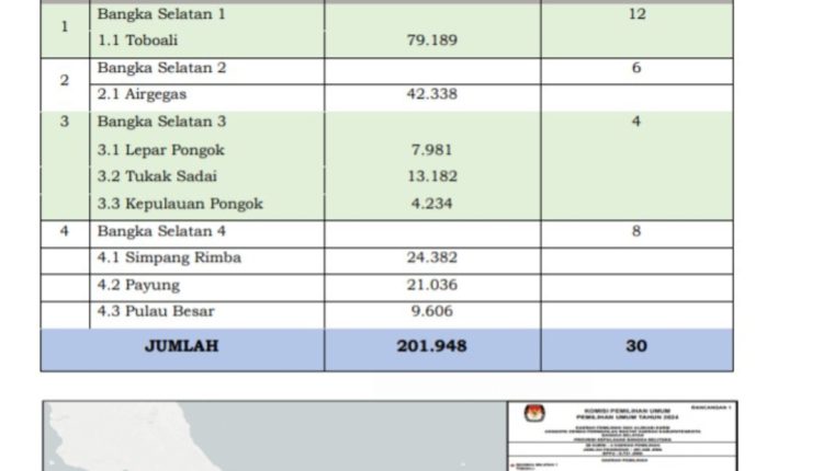 Dalam Rancangan 1 diterangkan bahwa dalam Dapil Bangka Selatan (Basel) 1 Kecamatan Toboali 12 kursi, Dapil Basel 2 Kecamatan Air Gegas sebanyak 6 kursi, Dapil 3 Kecamatan Lepar Pongok, Tukak Sadai, Kepulauan Pongok sebanyak 4 kursi dan Dapil Basel 4 Kecamatan Simpang Rimba, Payung dan Pulau Besar sebanyak 8 kursi