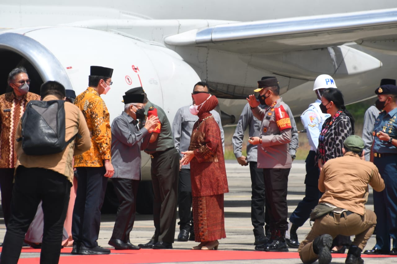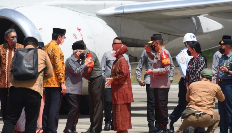 Pangkalpinang, Pangdam II/Sriwijaya Mayjen TNI Agus Suhardi didampingi Danrem 045/Gaya Brigjen TNI Ujang Darwis, MDA Sambut Wakil Presiden (Wapres) K.H. Ma’ruf Amin dan Ibu Hj. Wury Ma’ruf Amin beserta rombongan terbatas dalam rangka kunjungan kerja ke Provinsi Kepulauan Bangka Belitung, bertempat di VVIP Bandara Depati Amir Selasa (14/6/22).