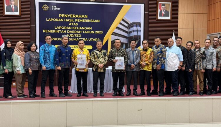 Penjabat (Pj) Bupati Padang Lawas Utara Patuan Rahmat Syukur P. Hasibuan, S.STP., MM., bersama Ketua DPRD Kabupaten Padang Lawas Utara Mukhlis Harahap, S.Hi., M.Si., menerima langsung Laporan Hasil Pemeriksaan (LHP) LKPD Pemerintah Kabupaten Padang Lawas Utara Tahun Anggaran 2023 oleh Ketua BPK RI Wilayah Sumatera Utara Eydu Oktain Panjaitan, S.E., M.M., Ak., CA., CSFA.