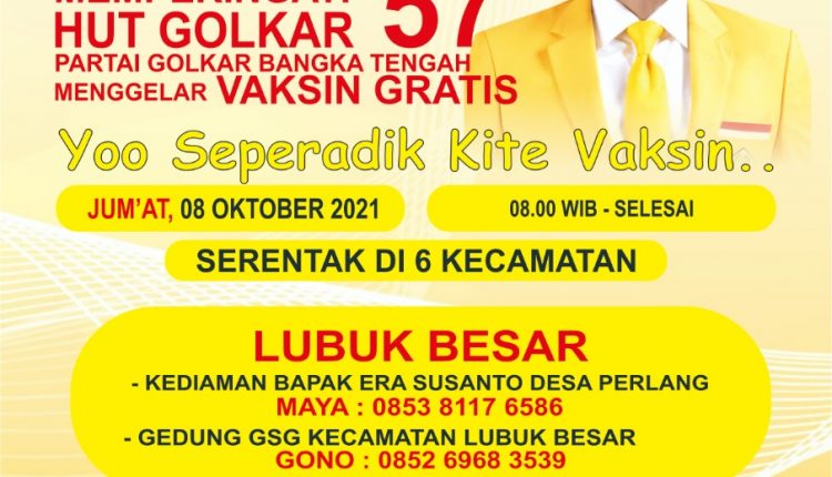 PANGKALPINANGPOST.COM KOBA – Dewan Pimpinan Daerah (DPD) Partai Golongan Karya (Golkar) Kabupaten Bangka Tengah akan gelar Vaksinasi Covid-19 secara gratis dalam rangka Memperingati Hari Ulang Tahun (HUT) Partai Golkar yang ke-57 pada 8 Oktober 2021 mendatang.