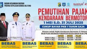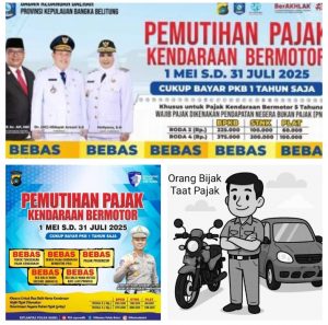 Pangkalpinangpost, Pangkalpinang – Kabar gembira bagi masyarakat Bangka Belitung! Mulai 1 Mei hingga 31 Juli 2025, Pemerintah Daerah Provinsi Kepulauan Bangka Belitung resmi meluncurkan program pemutihan pajak kendaraan bermotor (PKB) bagi seluruh pemilik kendaraan roda dua maupun roda empat. Program ini ditujukan untuk memberikan keringanan kepada masyarakat yang selama ini terkendala dalam membayar pajak kendaraan. (Senin,05/05/2025).