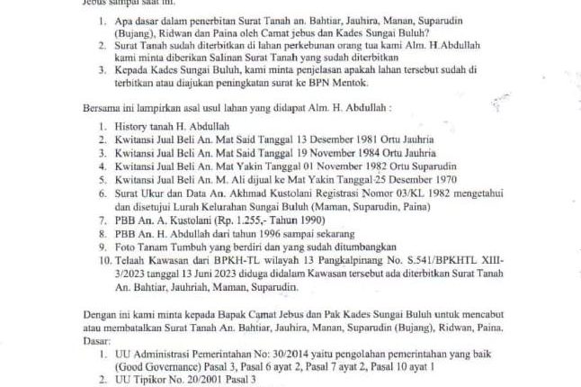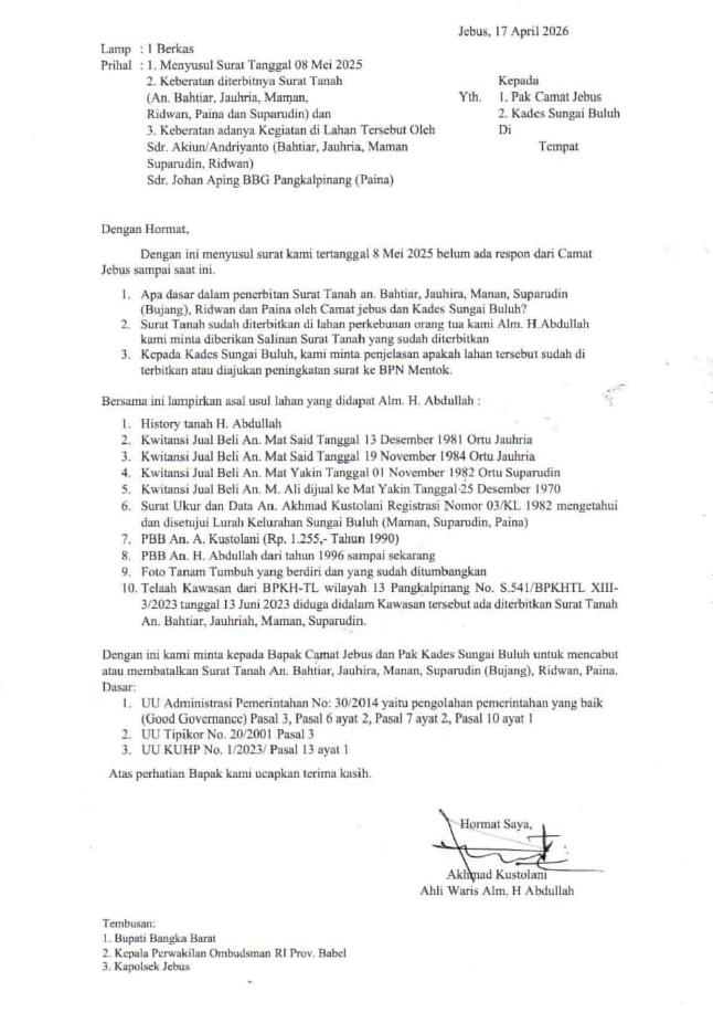 Dalam surat keberatan terbarunya, Kustolani secara tegas meminta penjelasan kepada Camat Jebus dan Kepala Desa Sungai Buluh terkait penerbitan surat tanah atas nama Bahtiar, Jauhria, Maman, Suparudin (Bujang), Ridwan, dan Paina. Ia juga menyoroti adanya aktivitas di lahan tersebut oleh sejumlah pihak, termasuk Akiun Andriyanto dan Johan Aping.